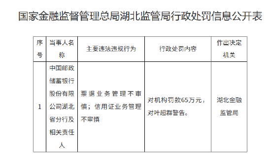 9月5日金融一线消息,据国家金融监督管理总局湖北监管局行政处罚信息公开表显示查询配资平台,中国邮政储蓄银行股份有限公司湖北省分行因票据业务管理不审慎,信用证业务管理不审慎,被罚款65万元。同时,相关责任人叶超群被警告。