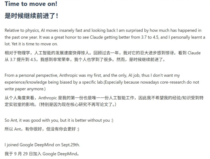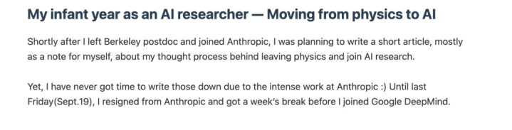 而在他看来,Anthropic是物理学家(或许也包括其他STEM背景的博士)开启AI研究之旅的最佳平台之一。值得注意的是,在Anthropic期间,他参与将Claude从3.7提升到4.5,AI惊人的发展速度让他惊讶,自己也学到了很多,「然而,是时候继续前进了。」