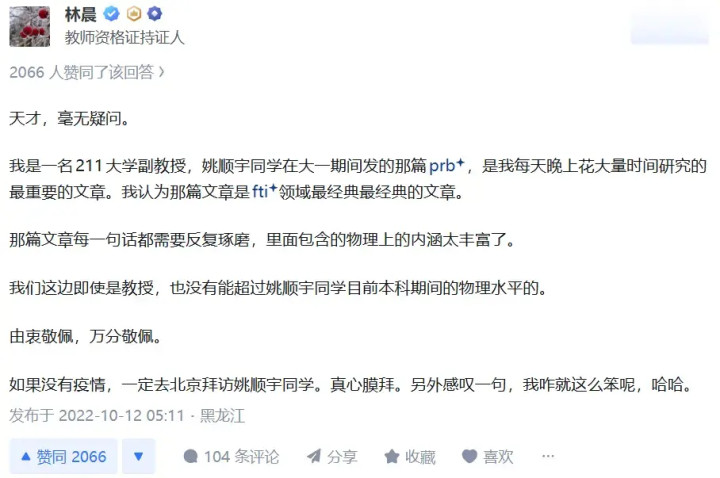 其在物理学研究上的卓越成就让一位211大学副教授也不禁感叹:「我们这边即使是教授,也没有能超过姚顺宇同学目前本科期间的物理水平的。」